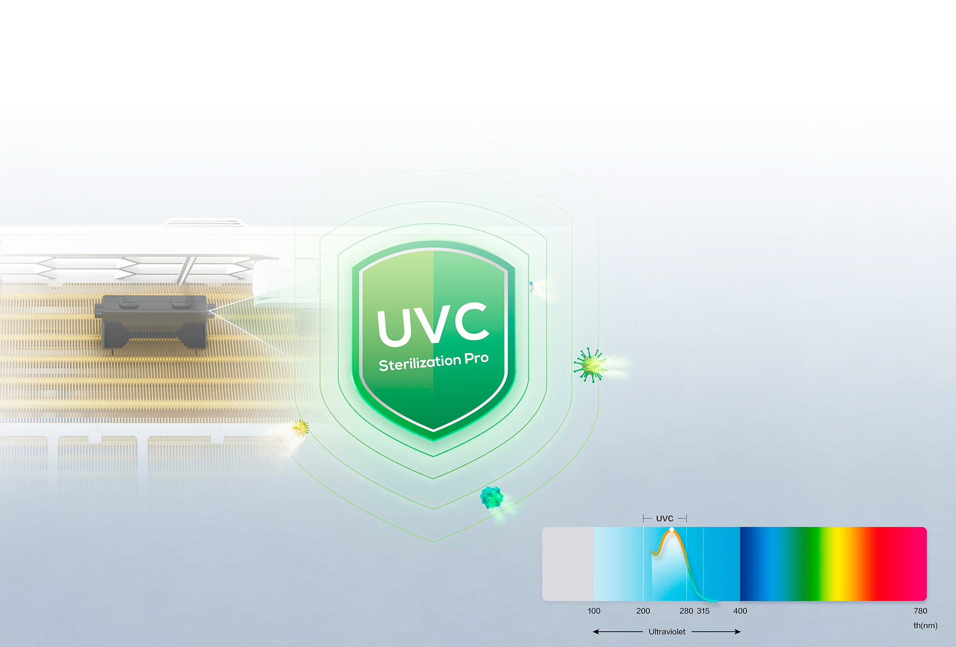 Ultraviolettkiirgus tagab kõrge efektiivsuse võitluses toksiinidega. Sertifitseeritud puhastusprotseduur hävitab viiruste ja bakterite DNA/RNA, tagades õhu steriliseerimise. Tapab 98,66% bakteritest.